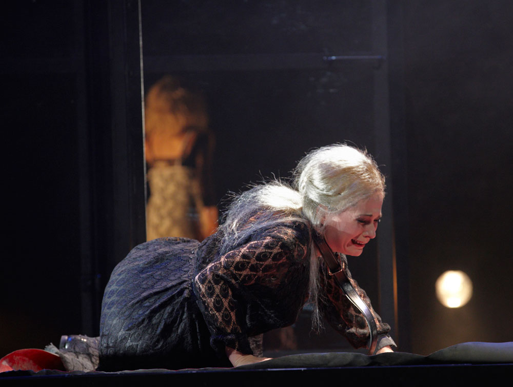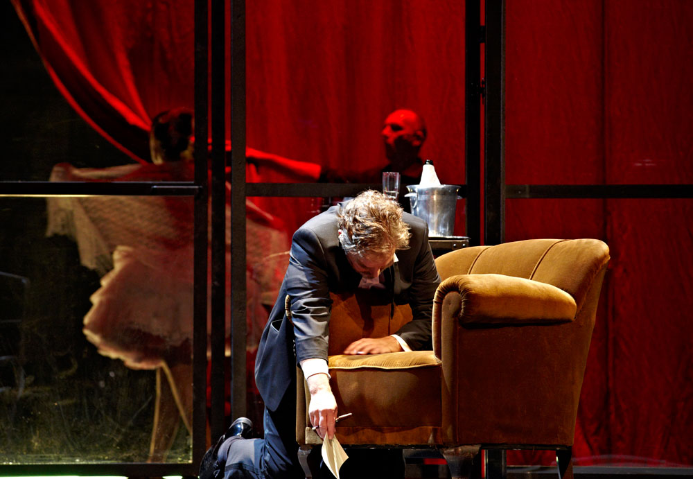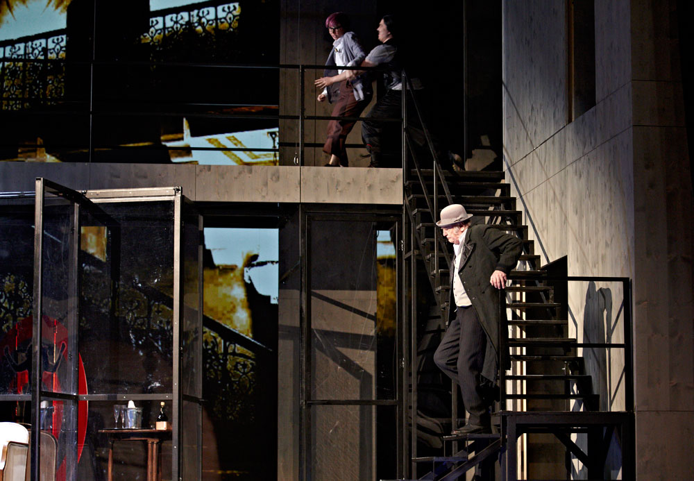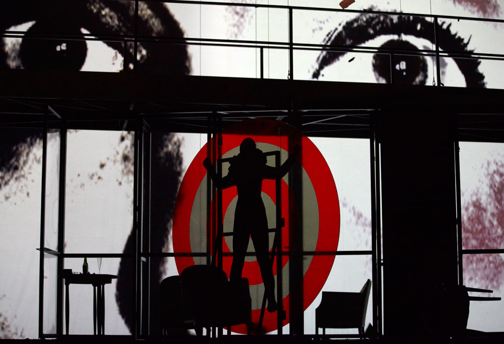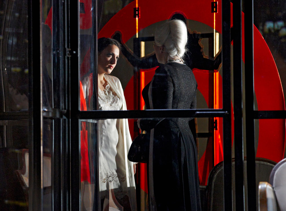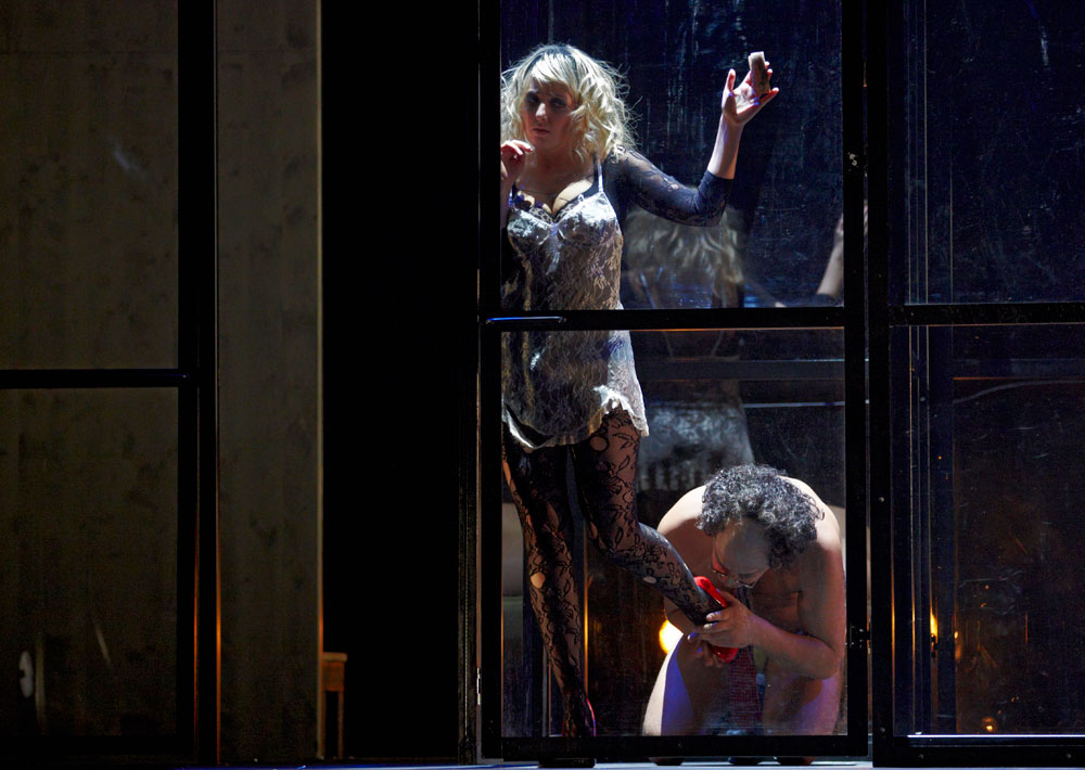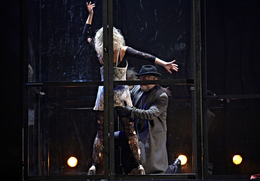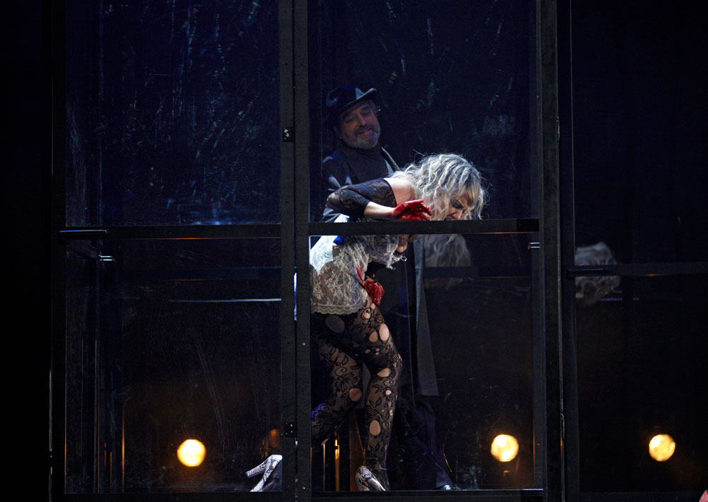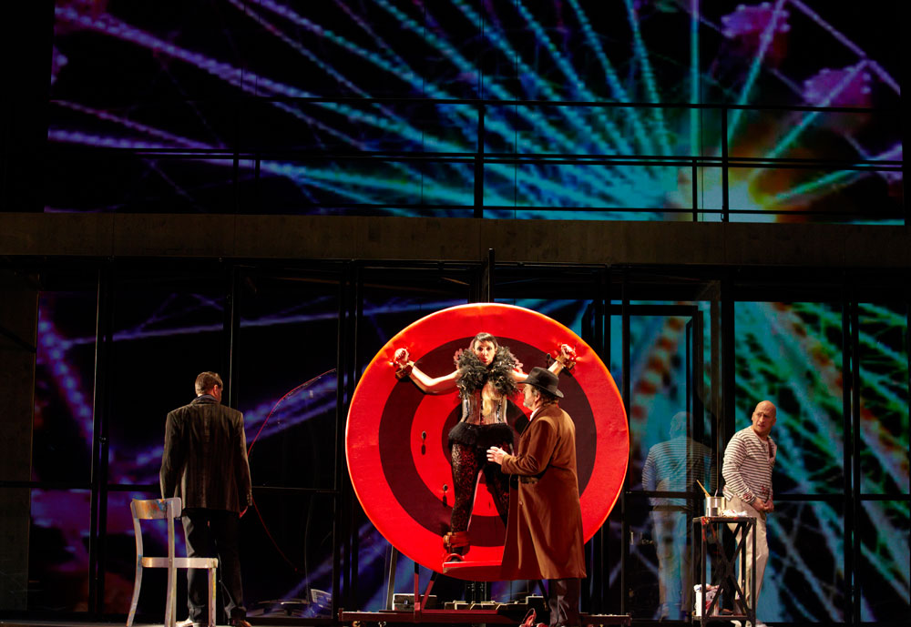 Monique Wagemakers’s intelligent production emphasized its own status as performance: in the green-room scene we got to see Lulu venturing entrances and dancing with a fan way upstage, and throughout she and Dr. Schön-Jack watched relevant action from a gallery above the main action, blocked largely on a revolving set (Momme Röhrbein) that in turn made apt use of multiple revolving glass doors. […]conductor Dirk Kaftan maintained a good balance and ensemble. Angelika Rieck’s colourful, raffish costumes also merited praise. Opera, David Shengold