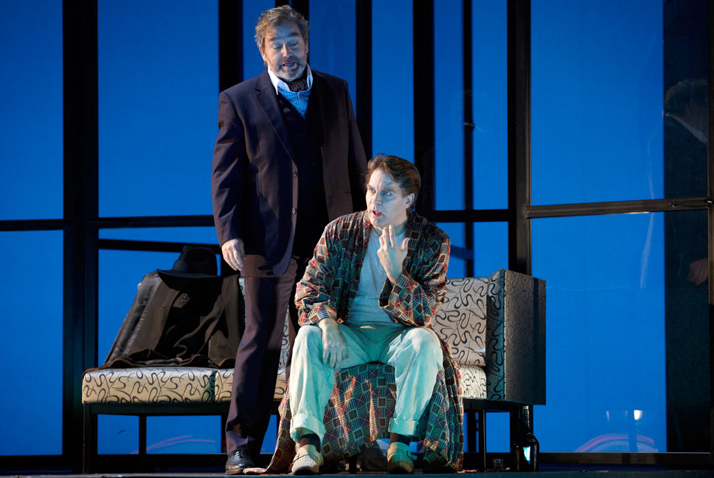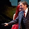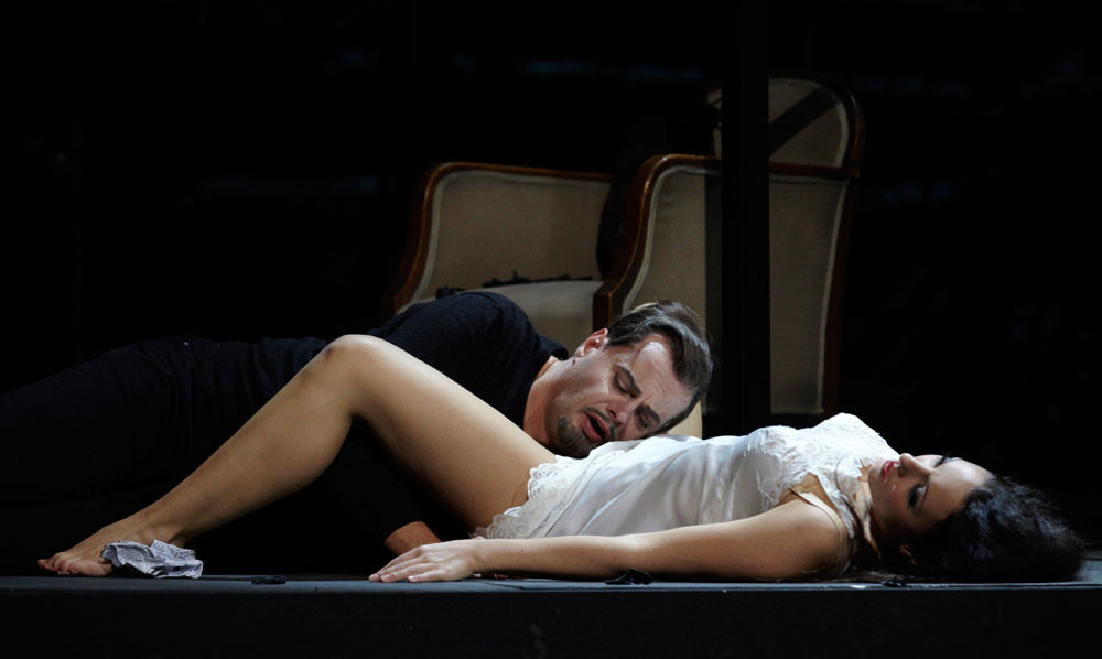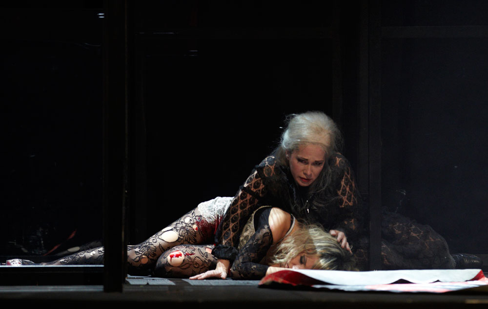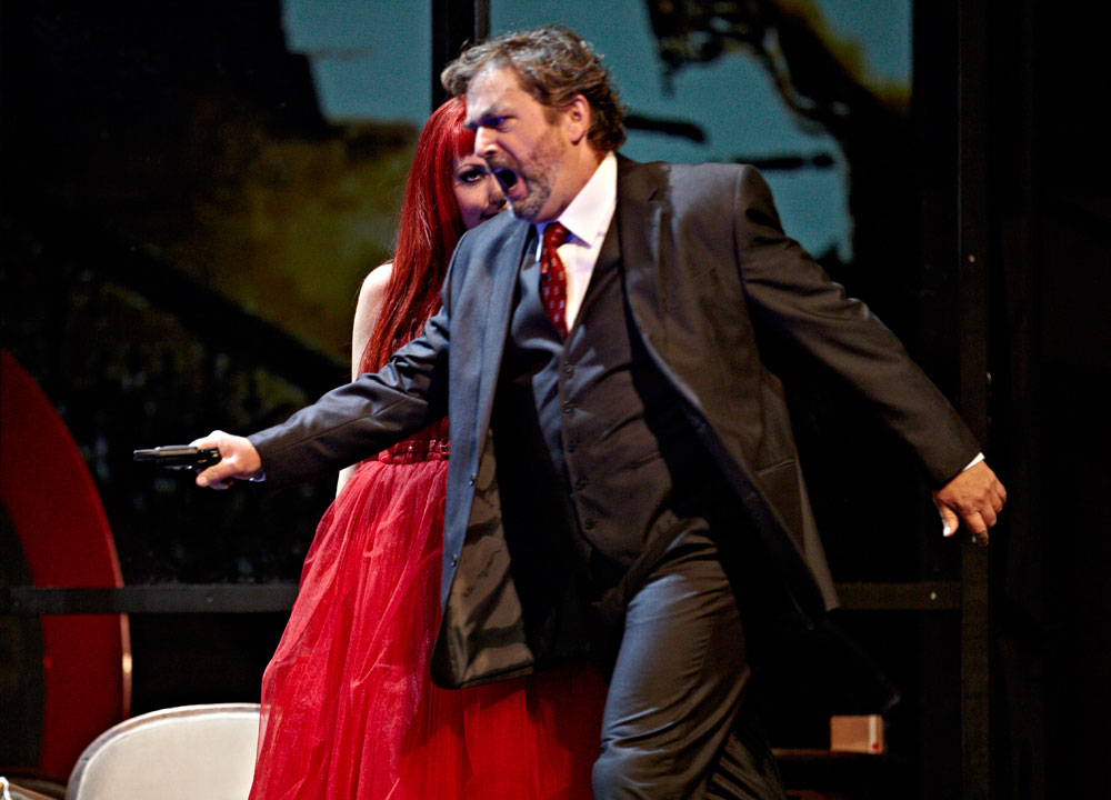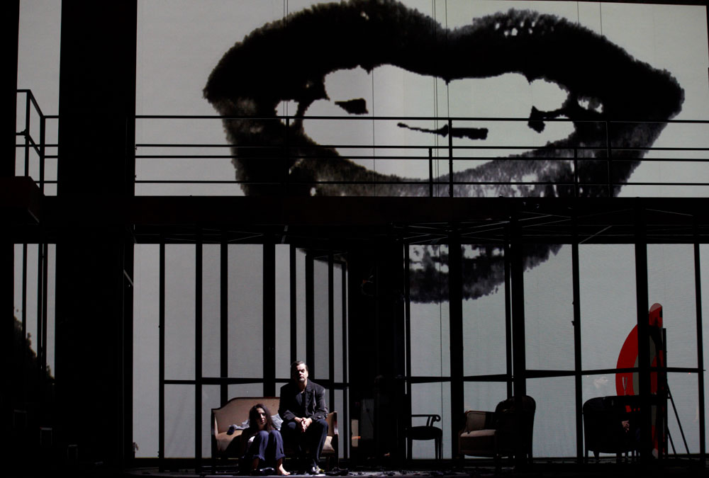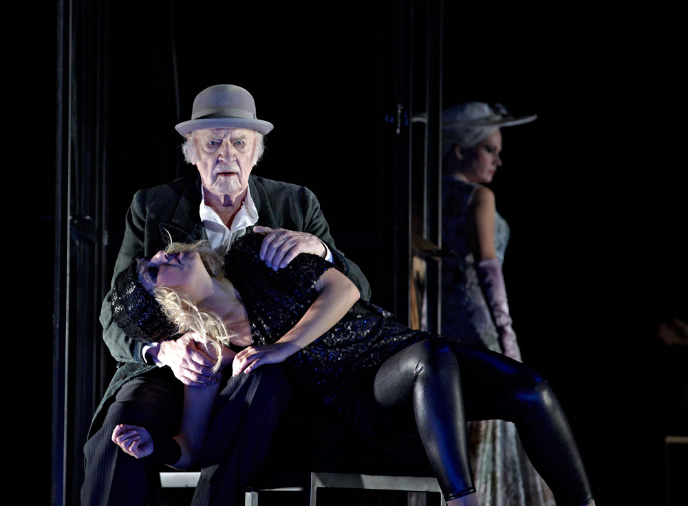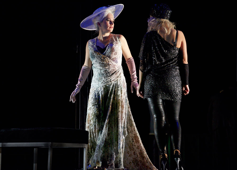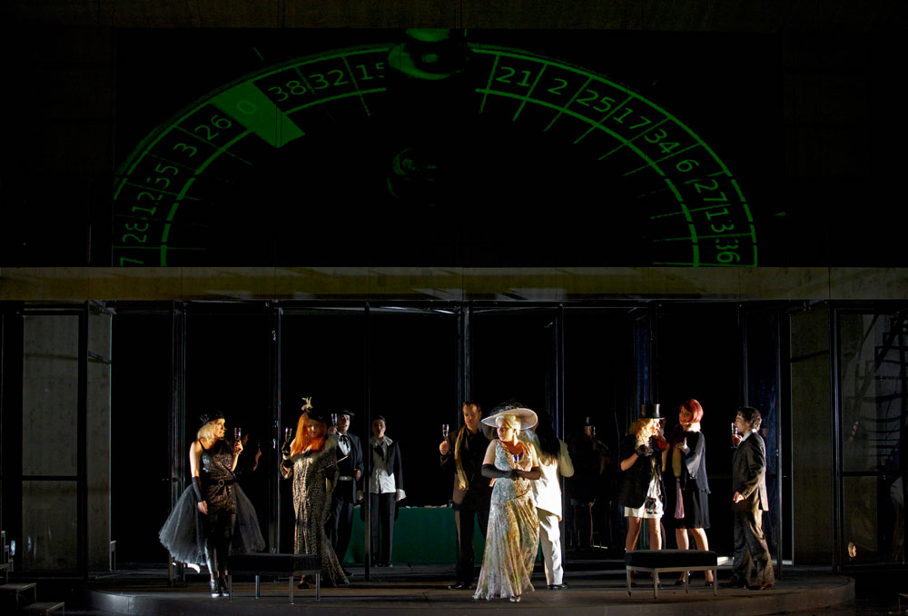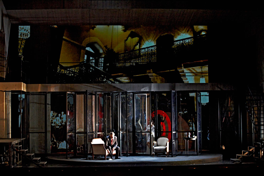 Monique Wagemakers’s intelligent production emphasized its own status as performance: in the green-room scene we got to see Lulu venturing entrances and dancing with a fan way upstage, and throughout she and Dr. Schön-Jack watched relevant action from a gallery above the main action, blocked largely on a revolving set (Momme Röhrbein) that in turn made apt use of multiple revolving glass doors. […]conductor Dirk Kaftan maintained a good balance and ensemble. Angelika Rieck’s colourful, raffish costumes also merited praise. Opera, David Shengold