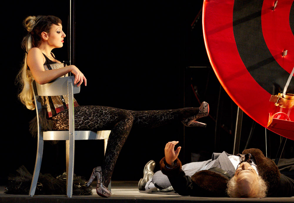 Lulu presents a tall order for a smaller house, however distinguished; but to its credit Theater Augsburg’s effective new staging (heard February 14) featured ensemble members in all but two of the roles – most memorable from that ensemble was Frans Mazura […] Augsburg opted for Eberhard Kloke’s revised third act, which makes sense for smaller houses in terms of orchestral texture. […] The staging started with her mounting a spinnable target, which – in a Pop Art version by the Painter[…] becomes her iconic portrait.