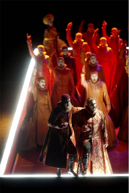 The focus shifted from individually disturbed behaviour to the communal decadence of the ducal court. Their clothes (magnificent costumes by the British designer Sandy Powell) were identical. These creatures seemed dehumanized, reduced to the level of parasites who feed on decay. These terrifying figures were present even in the final act, hovering vulture-like high above the stage.